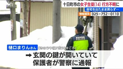 2026年1月26日夜から、十日町市新座の中学3年生:樋口まりんさん(14)が行方不明になりました。